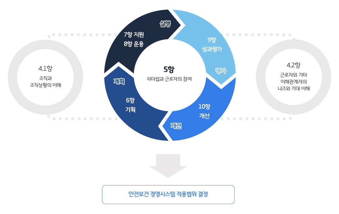 ISO 45001 안전보건경영시스템은 기업의 산업재해 예방과 쾌적한 작업환경 조성을 목적으로 하는 경영시스템입니다. 지속 가능 경영의 사회적 책임에 대한 대표적 표준으로 안전보건 리스크 및 기회 관리를 위한 틀을 통해 근로자의 업무와 관련된 기업의 산업재해 예방과 안전하고 건강한 작업장을 제공할 수 있도록 사용 지침을 제공합니다. 또한 모든 조직원 및 이해관계자가 참여하여, 조직원의 안전 및 보건의 유지, 증진을 위한 목표를 정하고 조직활동에 내재되어 있는 위험요인을 파악하고 관리하기 위한 조직, 책임, 절차를 규정하여 조직내의 물적, 인적자원을 효율적으로 배분하여 조직적으로 관리하는 경영시스템입니다.